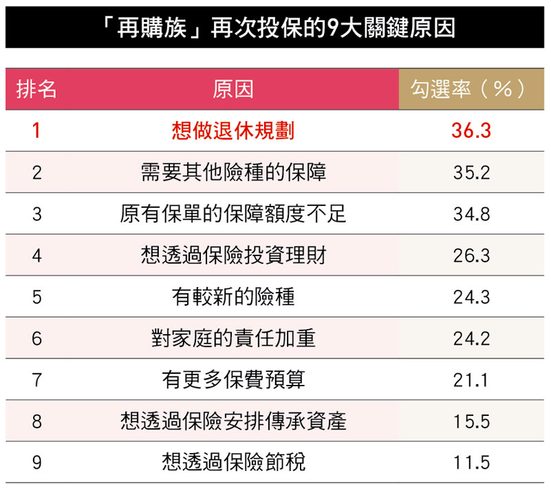此外,更多再購族是為了布局未來。高達36.3%再購族表示,是為了「退休規劃」所以想再買保險,也有高達26.3%是「想透過保險投資理財」。