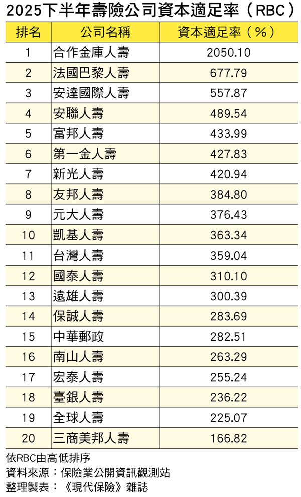 其中,合作金庫人壽RBC由2024年的1,285%大幅攀升至2025年的2,050%,為全體最高;法國巴黎人壽與安達國際人壽亦分別達677%與557%的高檔水準。