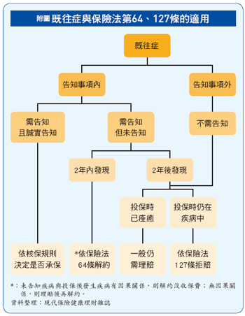 其實,業務員沒說的是,投保時隱匿的既往症,即使投保超過兩年,保險公司仍可依保險法第一二七條拒賠。但在主張拒賠的同時,保險公司通常也須面臨到三大難題,包括「疾病中」的認定、既往症與投保後疾病是否為同一事故,以及自覺症是否可主張適用。