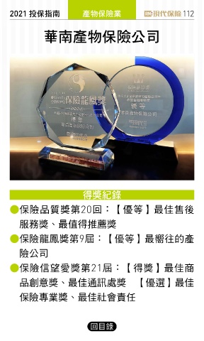2021 ҳڭܸی ପيڭᎈุ 112 ശیପيڭᎈʮ̡ ᆤߏ ● 保險品質獎第20回:【優等】最佳售後 服務獎、最值得推薦獎 ● 保險龍鳳獎第9屆:【優等】最嚮往的產 險公司 ● 保險信望愛獎第21屆:【得獎】最佳商 品創意獎、最佳通訊處獎 【優選】最佳 保險專業獎、最佳社會責任 回目錄