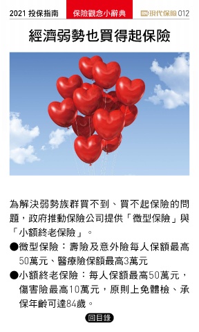 ɛྪڭᎈุ 2021 ҳڭܸی ڭᎈᝈׂʃᗘՊ 012 ࢮැɰ൯ৎڭᎈ 為解決弱勢族群買不到、買不起保險的問 題,政府推動保險公司提供「微型保險」與 「小額終老保險」。 ● 微型保險:壽險及意外險每人保額最高 50萬元、醫療險保額最高3萬元 ● 小額終老保險:每人保額最高50萬元, 傷害險最高10萬元,原則上免體檢、承 保年齡可達84歲。 回目錄