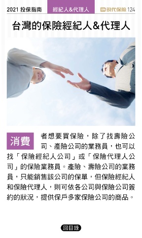 2021 ҳڭܸی ߏɛ&˾ଣɛ 124 ̨ᝄٙڭᎈߏɛ&˾ଣɛ 者想要買保險,除了找壽險公 ऊ൬ 司、產險公司的業務員,也可以 找「保險經紀人公司」或「保險代理人公 司」的保險業務員。產險、壽險公司的業務 員,只能銷售該公司的保單,但保險經紀人 和保險代理人,則可依各公司與保險公司簽 約的狀況,提供保戶多家保險公司的商品。 回目錄