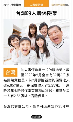 2021 ҳڭܸی ɛྪڭᎈุ 017 ̨ᝄٙɛྪڭᎈุ 的人壽保險業一片欣欣向榮,截 ̨ᝄ 至2020年9月全台有39萬6千多 名壽險業務員,前9月壽險新契約保費收入 達6,057億元,總保費收入達2.25兆元,壽 險及年金險投保率突破256.09%,相當於每 一人有2.56張以上壽險保單。 台灣的壽險公司,最早可追溯到1935年中 回目錄