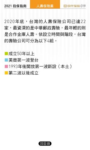 2021 ҳڭܸی ɛྪڭᎈุ 019 2020年底,台灣的人壽保險公司已達22 家,最資深的是中華郵政壽險,最年輕的則 是合作金庫人壽。依設立時間與階段,台灣 的壽險公司可分為以下4組。 ■成立50年以上 ■美商第一波登台 ■1993年後開放第一波新設(本土) ■第二波以後成立 回目錄