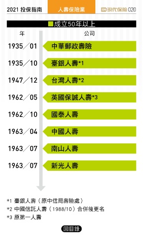 2021 ҳڭܸی ɛྪڭᎈุ 020 ■成立50年以上 年 公司 1935Ŋ01 ʕശඉ݁ྪᎈ 1935Ŋ10 ၽვɛྪ*1 1947Ŋ12 ̨ᝄɛྪ*2 1962Ŋ05 ߵڭ༐ɛྪ*3 1962Ŋ10 इɛྪ 1963Ŋ04 ʕɛྪ 1963Ŋ07 یʆɛྪ 1963Ŋ07 อΈɛྪ *1 臺銀人壽(原中信局壽險處) *2 中國信託人壽(1988/10)合併後更名 *3 原第一人壽 回目錄