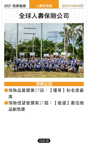 2021 ҳڭܸی ɛྪڭᎈุ 037 Όଢɛྪڭᎈʮ̡ ᆤߏ ● 保險品質獎第27回:【優等】知名度最 高 ● 保險信望愛獎第21屆:【優選】最佳商 品創意獎 回目錄