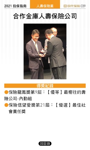 2021 ҳڭܸی ɛྪڭᎈุ 039 ΥЪږࢫɛྪڭᎈʮ̡ ᆤߏ ●保險龍鳳獎第9屆:【優等】最嚮往的壽 險公司-內勤組 ● 保險信望愛獎第21屆:【優選】最佳社 會責任獎 回目錄