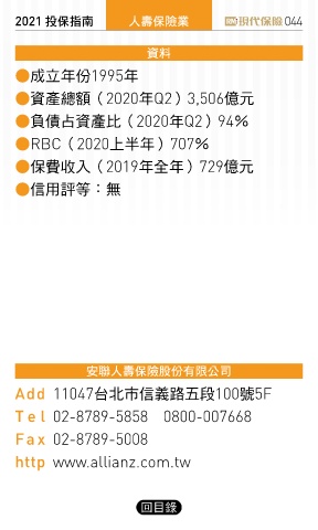 2021 ҳڭܸی ɛྪڭᎈุ 044 ༟ࣘ ●成立年份1995年 ●資產總額(2020年Q2)3,506億元 ●負債占資產比(2020年Q2)94% ●RBC(2020上半年)707% ●保費收入(2019年全年)729億元 ●信用評等:無 τᑌɛྪڭᎈٰ΅Ϟࠢʮ̡ Add 11047台北市信義路五段100號5F Te l 02-8789-5858 0800-007668 Fa x 02-8789-5008 http www.allianz.com.tw 回目錄