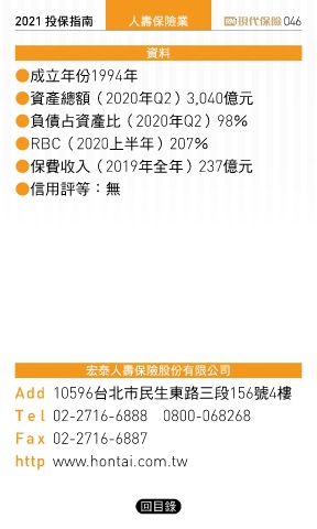2021 ҳڭܸی ɛྪڭᎈุ 046 ༟ࣘ ●成立年份1994年 ●資產總額(2020年Q2)3,040億元 ●負債占資產比(2020年Q2)98% ●RBC(2020上半年)207% ●保費收入(2019年全年)237億元 ●信用評等:無 ҃इɛྪڭᎈٰ΅Ϟࠢʮ̡ Add 10596台北市民生東路三段156號4樓 Te l 02-2716-6888 0800-068268 Fa x 02-2716-6887 http www.hontai.com.tw 回目錄