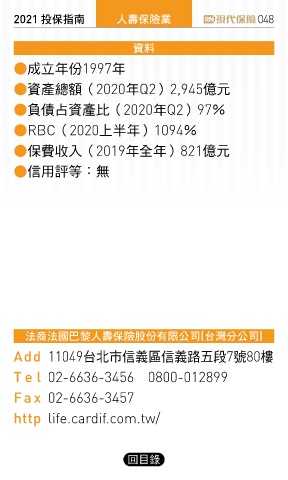 2021 ҳڭܸی ɛྪڭᎈุ 048 ༟ࣘ ●成立年份1997年 ●資產總額(2020年Q2)2,945億元 ●負債占資產比(2020年Q2)97% ●RBC(2020上半年)1094% ●保費收入(2019年全年)821億元 ●信用評等:無 جਠجˋኇɛྪڭᎈٰ΅Ϟࠢʮ̡(̨ᝄʱʮ̡) Add 11049台北市信義區信義路五段7號80樓 Te l 02-6636-3456 0800-012899 Fa x 02-6636-3457 http life.cardif.com.tw/ 回目錄