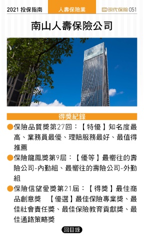 2021 ҳڭܸی ɛྪڭᎈุ 051 یʆɛྪڭᎈʮ̡ ᆤߏ ● 保險品質獎第27回:【特優】知名度最 高、業務員最優、理賠服務最好、最值得 推薦 ● 保險龍鳳獎第9屆:【優等】最嚮往的壽 險公司-內勤組、最嚮往的壽險公司-外勤 組 ● 保險信望愛獎第21屆:【得獎】最佳商 品創意獎 【優選】最佳保險專業獎、最 佳社會責任獎、最佳保險教育貢獻獎、最 佳通路策略獎 回目錄