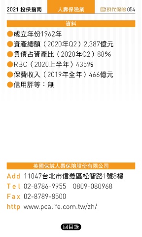 2021 ҳڭܸی ɛྪڭᎈุ 054 ༟ࣘ ●成立年份1962年 ●資產總額(2020年Q2)2,387億元 ●負債占資產比(2020年Q2)88% ●RBC(2020上半年)435% ●保費收入(2019年全年)466億元 ●信用評等:無 ߵڭ༐ɛྪڭᎈٰ΅Ϟࠢʮ̡ Add 11047台北市信義區松智路1號8樓 Te l 02-8786-9955 0809-080968 Fa x 02-8789-8500 http www.pcalife.com.tw/zh/ 回目錄