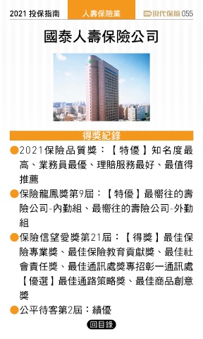 2021 ҳڭܸی ɛྪڭᎈุ 055 इɛྪڭᎈʮ̡ ᆤߏ ● 2021 保險品質獎:【特優】知名度最 高、業務員最優、理賠服務最好、最值得 推薦 ● 保險龍鳳獎第9屆:【特優】最嚮往的壽 險公司-內勤組、最嚮往的壽險公司-外勤 組 ● 保險信望愛獎第21屆:【得獎】最佳保 險專業獎、最佳保險教育貢獻獎、最佳社 會責任獎、最佳通訊處獎專招彰一通訊處 【優選】最佳通路策略獎、最佳商品創意 獎 ●公平待客第2屆:績優 回目錄