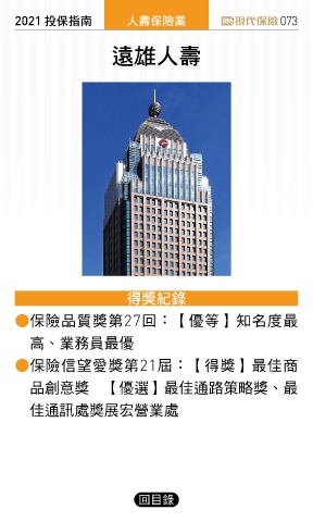 2021 ҳڭܸی ɛྪڭᎈุ 073 Ⴣඪɛྪ ᆤߏ ● 保險品質獎第27回:【優等】知名度最 高、業務員最優 ● 保險信望愛獎第21屆:【得獎】最佳商 品創意獎 【優選】最佳通路策略獎、最 佳通訊處獎展宏營業處 回目錄
