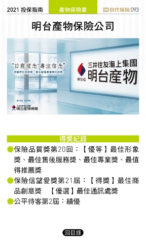 2021 ҳڭܸی ପيڭᎈุ 093 ̨ପيڭᎈʮ̡ ᆤߏ ● 保險品質獎第20回:【優等】最佳形象 獎、最佳售後服務獎、最佳專業獎、最值 得推薦獎 ● 保險信望愛獎第21屆:【得獎】最佳商 品創意獎 【優選】最佳通訊處獎 ●公平待客第2屆:績優 回目錄