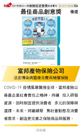 2021ϋୋ22+1֣ڭᎈڦૐฌᆤ ߏׂਖ਼̊ 104 ௰Գਠۜ௴จᆤ Ꮄ፯ బԞପيڭᎈʮ̡ 法定傳染病醫療及費用補償保險 COVID-19 疫情風暴襲捲全球,富邦產險以 善盡企業社會責任之精神,持續 投入研發 資源,因時制宜提供消費者 多元的保障與 選擇。未來,將繼續聚 焦社會動態及消費 者需求,創造更完善之保險商品與服務。 Ϋͦ