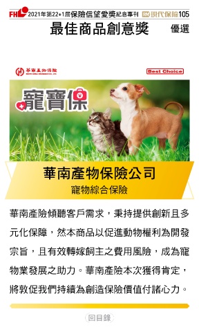 2021ϋୋ22+1֣ڭᎈڦૐฌᆤ ߏׂਖ਼̊ 105 ௰Գਠۜ௴จᆤ Ꮄ፯ ശیପيڭᎈʮ̡ 寵物綜合保險 華南產險傾聽客戶需求,秉持提供創新且多 元化保障,然本商品以促進動物權利為開發 宗旨,且有效轉嫁飼主之費用風險,成為寵 物業發展之助力。華南產險本次獲得肯定, 將敦促我們持續為創造保險價值付諸心力。 Ϋͦ