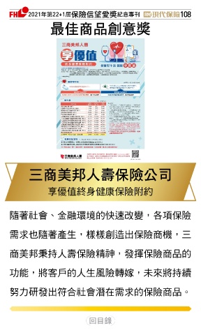 2021ϋୋ22+1֣ڭᎈڦૐฌᆤ ߏׂਖ਼̊ 108 ௰Գਠۜ௴จᆤ ɧਠߕԞɛྪڭᎈʮ̡ 享優值終身健康保險附約 隨著社會、金融環境的快速改變,各項保險 需求也隨著產生,樣樣創造出保險商機,三 商美邦秉持人壽保險精神,發揮保險商品的 功能,將客戶的人生風險轉嫁,未來將持續 努力研發出符合社會潛在需求的保險商品。 Ϋͦ