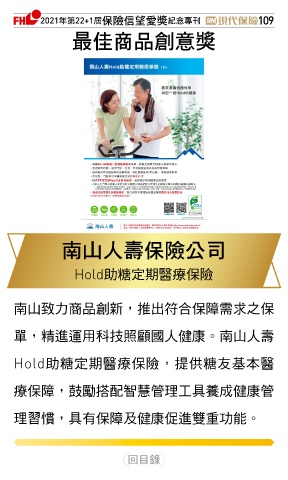 2021ϋୋ22+1֣ڭᎈڦૐฌᆤ ߏׂਖ਼̊ 109 ௰Գਠۜ௴จᆤ یʆɛྪڭᎈʮ̡ Hold助糖定期醫療保險 南山致力商品創新,推出符合保障需求之保 單,精進運用科技照顧國人健康。南山人壽 Hold助糖定期醫療保險,提供糖友基本醫 療保障,鼓勵搭配智慧管理工具養成健康管 理習慣,具有保障及健康促進雙重功能。 Ϋͦ