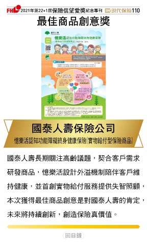 2021ϋୋ22+1֣ڭᎈڦૐฌᆤ ߏׂਖ਼̊ 110 ௰Գਠۜ௴จᆤ इɛྪڭᎈʮ̡ 憶樂活認知功能障礙終身健康保險(實物給付型保險商品) 國泰人壽長期關注高齡議題,契合客戶需求 研發商品,憶樂活設計外溢機制陪伴客戶維 持健康,並首創實物給付服務提供失智照顧, 本次獲得最佳商品創意是對國泰人壽的肯定, 未來將持續創新,創造保險真價值。 Ϋͦ