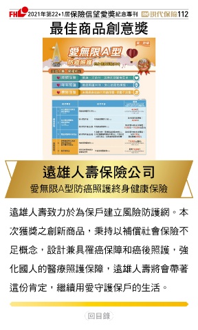 2021ϋୋ22+1֣ڭᎈڦૐฌᆤ ߏׂਖ਼̊ 112 ௰Գਠۜ௴จᆤ Ⴣඪɛྪڭᎈʮ̡ 愛無限A型防癌照護終身健康保險 遠雄人壽致力於為保戶建立風險防護網。本 次獲獎之創新商品,秉持以補償社會保險不 足概念,設計兼具罹癌保障和癌後照護,強 化國人的醫療照護保障,遠雄人壽將會帶著 這份肯定,繼續用愛守護保戶的生活。 Ϋͦ