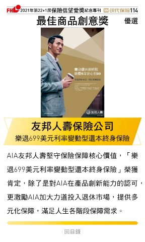 2021ϋୋ22+1֣ڭᎈڦૐฌᆤ ߏׂਖ਼̊ 114 ௰Գਠۜ௴จᆤ Ꮄ፯ ʾԞɛྪڭᎈʮ̡ 樂退699美元利率變動型還本終身保險 AIA友邦人壽堅守保險保障核心價值,「樂 退699美元利率變動型還本終身保險」榮獲 肯定,除了是對AIA在產品創新能力的認可, 更激勵AIA加大力道投入退休市場,提供多 元化保障,滿足人生各階段保障需求。 Ϋͦ