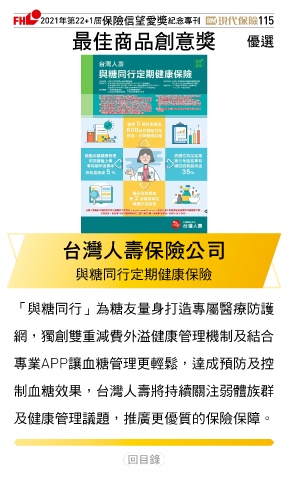 2021ϋୋ22+1֣ڭᎈڦૐฌᆤ ߏׂਖ਼̊ 115 ௰Գਠۜ௴จᆤ Ꮄ፯ ̨ᝄɛྪڭᎈʮ̡ 與糖同行定期健康保險 「與糖同行」為糖友量身打造專屬醫療防護 網,獨創雙重減費外溢健康管理機制及結合 專業APP讓血糖管理更輕鬆,達成預防及控 制血糖效果,台灣人壽將持續關注弱體族群 及健康管理議題,推廣更優質的保險保障。 Ϋͦ