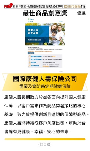 2021ϋୋ22+1֣ڭᎈڦૐฌᆤ ߏׂਖ਼̊ 116 ௰Գਠۜ௴จᆤ Ꮄ፯ ყੰɛྪڭᎈʮ̡ 愛要及實防癌定期健康保險 康健人壽長期致力於從各面向提升國人健康 保障,以客戶需求作為商品開發策略的核心 基礎,致力於提供創新且適切的保障型商品。 康健人壽將持續從客戶角度出發,幫助消費 者擁有更健康、幸福、安心的未來。 Ϋͦ