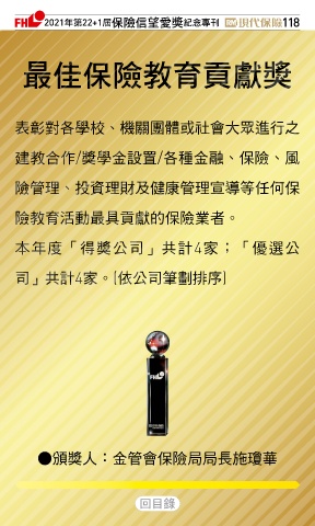 2021ϋୋ22+1֣ڭᎈڦૐฌᆤ ߏׂਖ਼̊ 118 ௰Գڭᎈԃ্ᘠᆤ 表彰對各學校、機關團體或社會大眾進行之 建教合作/獎學金設置/各種金融、保險、風 險管理、投資理財及健康管理宣導等任何保 險教育活動最具貢獻的保險業者。 本年度「得獎公司」共計4家;「優選公 司」共計4家。(依公司筆劃排序) ●頒獎人:金管會保險局局長施瓊華 Ϋͦ