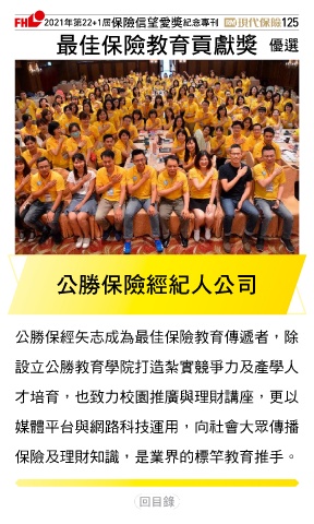 2021ϋୋ22+1֣ڭᎈڦૐฌᆤ ߏׂਖ਼̊ 125 ௰Գڭᎈԃ্ᘠᆤ Ꮄ፯ ʮ௷ڭᎈߏɛʮ̡ 公勝保經矢志成為最佳保險教育傳遞者,除 設立公勝教育學院打造紮實競爭力及產學人 才培育,也致力校園推廣與理財講座,更以 媒體平台與網路科技運用,向社會大眾傳播 保險及理財知識,是業界的標竿教育推手。 Ϋͦ