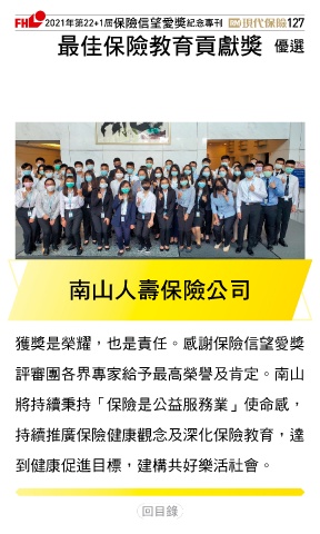 2021ϋୋ22+1֣ڭᎈڦૐฌᆤ ߏׂਖ਼̊ 127 ௰Գڭᎈԃ্ᘠᆤ Ꮄ፯ یʆɛྪڭᎈʮ̡ 獲獎是榮耀,也是責任。感謝保險信望愛獎 評審團各界專家給予最高榮譽及肯定。南山 將持續秉持「保險是公益服務業」使命感, 持續推廣保險健康觀念及深化保險教育,達 到健康促進目標,建構共好樂活社會。 Ϋͦ