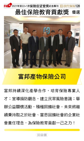 2021ϋୋ22+1֣ڭᎈڦૐฌᆤ ߏׂਖ਼̊ 128 ௰Գڭᎈԃ্ᘠᆤ Ꮄ፯ బԞପيڭᎈʮ̡ 富邦持續深化產學合作,培育保險專業人 才;宣導損防觀念,建立民眾風險意識;舉 辦公益關懷活動,積極回饋社會。未來將繼 續秉持取之於社會、當思回饋社會的企業社 會責任理念,為保險教育貢獻一己之力! Ϋͦ