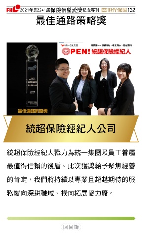 2021ϋୋ22+1֣ڭᎈڦૐฌᆤ ߏׂਖ਼̊ 132 ௰Գஷ༩ഄଫᆤ ୕൴ڭᎈߏɛʮ̡ 統超保險經紀人戮力為統一集團及員工眷屬 最值得信賴的後盾。此次獲獎給予聚焦經營 的肯定,我們將持續以專業且超越期待的服 務縱向深耕職域、橫向拓展協力廠。 Ϋͦ