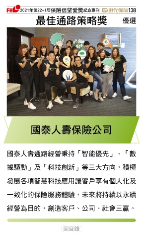 2021ϋୋ22+1֣ڭᎈڦૐฌᆤ ߏׂਖ਼̊ 138 ௰Գஷ༩ഄଫᆤ Ꮄ፯ इɛྪڭᎈʮ̡ 國泰人壽通路經營秉持「智能優先」、「數 據驅動」及「科技創新」等三大方向,積極 發展各項智慧科技應用讓客戶享有個人化及 一致化的保險服務體驗,未來將持續以永續 經營為目的,創造客戶、公司、社會三贏。 Ϋͦ