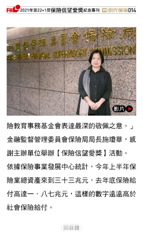 2021ϋୋ22+1֣ڭᎈڦૐฌᆤ ߏׂਖ਼̊ 014 ᅂ˪ 險教育事務基金會表達最深的敬佩之意。」 金融監督管理委員會保險局局長施瓊華,感 謝主辦單位舉辦【保險信望愛獎】活動。 依據保險事業發展中心統計,今年上半年保 險業總資產來到三十三兆元,去年底保險給 付高達一.八七兆元,這樣的數字遠遠高於 社會保險給付。 Ϋͦ