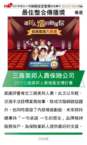 2021ϋୋ22+1֣ڭᎈڦૐฌᆤ ߏׂਖ਼̊ 146 ௰ԳΥෂᅧᆤ Ꮄ፯ ɧਠߕԞɛྪڭᎈʮ̡ 2019三商美邦人壽增員宣傳計畫 感謝評審肯定三商美邦人壽!此次以年輕、 活潑手法詮釋業務故事,除成功發網路話題 外,也同時激發了內部增員動能,未來將持 續秉持「一句承諾 一生的朋友」品牌精神 服務保戶,為保險業新人提供最好的支援。 Ϋͦ