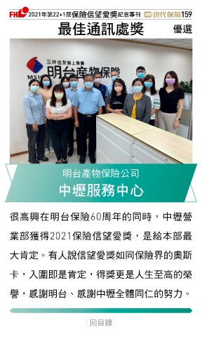 2021ϋୋ22+1֣ڭᎈڦૐฌᆤ ߏׂਖ਼̊ 159 ௰Գஷৃஈᆤ Ꮄ፯ 明台產物保險公司 ʕᕺਕʕː 很高興在明台保險60周年的同時,中壢營 業部獲得2021保險信望愛獎,是給本部最 大肯定。有人說信望愛獎如同保險界的奧斯 卡,入圍即是肯定,得獎更是人生至高的榮 譽,感謝明台、感謝中壢全體同仁的努力。 Ϋͦ