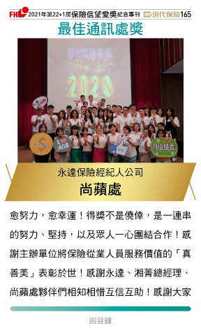2021ϋୋ22+1֣ڭᎈڦૐฌᆤ ߏׂਖ਼̊ 165 ௰Գஷৃஈᆤ 永達保險經紀人公司 ֠ᘼஈ 愈努力,愈幸運!得獎不是僥倖,是一連串 的努力、堅持,以及眾人一心團結合作!感 謝主辦單位將保險從業人員服務價值的「真 善美」表彰於世!感謝永達、湘菁總經理、 尚蘋處夥伴們相知相惜互信互助!感謝大家 Ϋͦ
