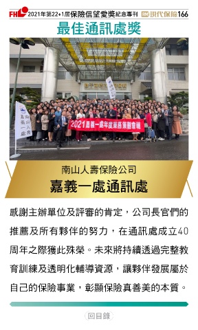 2021ϋୋ22+1֣ڭᎈڦૐฌᆤ ߏׂਖ਼̊ 166 ௰Գஷৃஈᆤ 南山人壽保險公司 ྗ່ɓஈஷৃஈ 感謝主辦單位及評審的肯定,公司長官們的 推薦及所有夥伴的努力,在通訊處成立40 周年之際獲此殊榮。未來將持續透過完整教 育訓練及透明化輔導資源,讓夥伴發展屬於 自己的保險事業,彰顯保險真善美的本質。 Ϋͦ