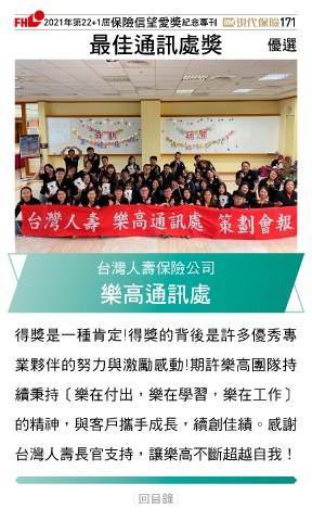 2021ϋୋ22+1֣ڭᎈڦૐฌᆤ ߏׂਖ਼̊ 171 ௰Գஷৃஈᆤ Ꮄ፯ 台灣人壽保險公司 ᆀ৷ஷৃஈ 得獎是一種肯定!得獎的背後是許多優秀專 業夥伴的努力與激勵感動!期許樂高團隊持 續秉持〔樂在付出,樂在學習,樂在工作〕 的精神,與客戶攜手成長,續創佳績。感謝 台灣人壽長官支持,讓樂高不斷超越自我! Ϋͦ