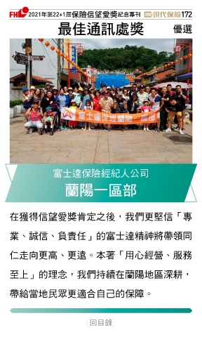 2021ϋୋ22+1֣ڭᎈڦૐฌᆤ ߏׂਖ਼̊ 172 ௰Գஷৃஈᆤ Ꮄ፯ 富士達保險經紀人公司 ᚆජɓਜ 在獲得信望愛獎肯定之後,我們更堅信「專 業、誠信、負責任」的富士達精神將帶領同 仁走向更高、更遠。本著「用心經營、服務 至上」的理念,我們持續在蘭陽地區深耕, 帶給當地民眾更適合自己的保障。 Ϋͦ