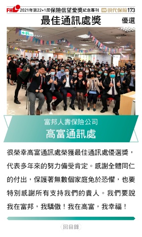 2021ϋୋ22+1֣ڭᎈڦૐฌᆤ ߏׂਖ਼̊ 173 ௰Գஷৃஈᆤ Ꮄ፯ 富邦人壽保險公司 ৷బஷৃஈ 很榮幸高富通訊處榮獲最佳通訊處優選獎, 代表多年來的努力備受肯定。感謝全體同仁 的付出,保護著無數個家庭免於恐懼,也要 特別感謝所有支持我們的貴人。我們要說 我在富邦,我驕傲!我在高富,我幸福! Ϋͦ