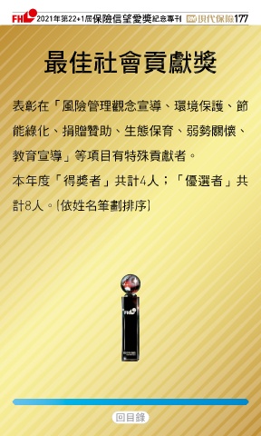 2021ϋୋ22+1֣ڭᎈڦૐฌᆤ ߏׂਖ਼̊ 177 ௰Գٟึ্ᘠᆤ 表彰在「風險管理觀念宣導、環境保護、節 能綠化、捐贈贊助、生態保育、弱勢關懷、 教育宣導」等項目有特殊貢獻者。 本年度「得獎者」共計4人;「優選者」共 計8人。(依姓名筆劃排序) Ϋͦ