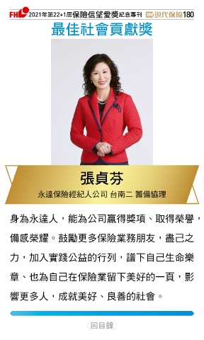 2021ϋୋ22+1֣ڭᎈڦૐฌᆤ ߏׂਖ਼̊ 180 ௰Գٟึ্ᘠᆤ ੵࠊځ 永達保險經紀人公司 台南二 籌備協理 身為永達人,能為公司贏得獎項、取得榮譽, 備感榮耀。鼓勵更多保險業務朋友,盡己之 力,加入實踐公益的行列,譜下自己生命樂 章、也為自己在保險業留下美好的一頁,影 響更多人,成就美好、良善的社會。 Ϋͦ