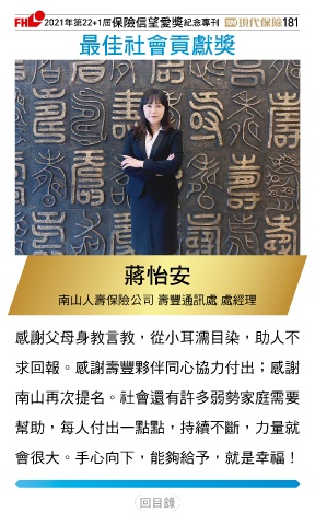 2021ϋୋ22+1֣ڭᎈڦૐฌᆤ ߏׂਖ਼̊ 181 ௰Գٟึ্ᘠᆤ ᇸτ 南山人壽保險公司 壽豐通訊處 處經理 感謝父母身教言教,從小耳濡目染,助人不 求回報。感謝壽豐夥伴同心協力付出;感謝 南山再次提名。社會還有許多弱勢家庭需要 幫助,每人付出一點點,持續不斷,力量就 會很大。手心向下,能夠給予,就是幸福! Ϋͦ