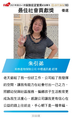 2021ϋୋ22+1֣ڭᎈڦૐฌᆤ ߏׂਖ਼̊ 183 ௰Գٟึ্ᘠᆤ Ꮄ፯ ϡˏҔ 和泰產物保險公司 中壢通訊處 經理 老天爺給了我一份好工作,公司給了我發揮 的空間,讓我有能力在社會付出一己之力, 照顧幼兒與社區服務,偏鄉孩子生活教育更 成為我生活重心。感謝公司讓我更有信心在 公益的路上往前走,手心朝下是一種幸福。 Ϋͦ