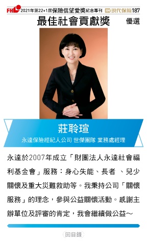 2021ϋୋ22+1֣ڭᎈڦૐฌᆤ ߏׂਖ਼̊ 187 ௰Գٟึ্ᘠᆤ Ꮄ፯ ୩⒚ 永達保險經紀人公司 世傑團隊 業務處經理 永達於2007年成立「財團法人永達社會福 利基金會」服務:身心失能、長者 、兒少 關懷及重大災難救助等。我秉持公司「關懷 服務」的理念,參與公益關懷活動。感謝主 辦單位及評審的肯定,我會繼續做公益~ Ϋͦ