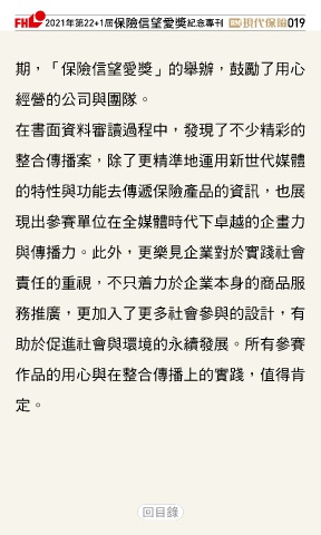 2021ϋୋ22+1֣ڭᎈڦૐฌᆤ ߏׂਖ਼̊ 019 期,「保險信望愛獎」的舉辦,鼓勵了用心 經營的公司與團隊。 在書面資料審讀過程中,發現了不少精彩的 整合傳播案,除了更精準地運用新世代媒體 的特性與功能去傳遞保險產品的資訊,也展 現出參賽單位在全媒體時代下卓越的企畫力 與傳播力。此外,更樂見企業對於實踐社會 責任的重視,不只着力於企業本身的商品服 務推廣,更加入了更多社會參與的設計,有 助於促進社會與環境的永續發展。所有參賽 作品的用心與在整合傳播上的實踐,值得肯 定。 Ϋͦ