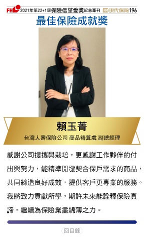 2021ϋୋ22+1֣ڭᎈڦૐฌᆤ ߏׂਖ਼̊ 196 ௰Գڭᎈϓఱᆤ ፠͗വ 台灣人壽保險公司 商品精算處 副總經理 感謝公司提攜與栽培,更感謝工作夥伴的付 出與努力,能精準開發契合保戶需求的商品, 共同締造良好成效,提供客戶更專業的服務。 我將致力貢獻所學,期許未來能詮釋保險真 諦,繼續為保險業盡綿薄之力。 Ϋͦ