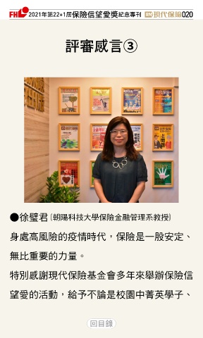 2021ϋୋ22+1֣ڭᎈڦૐฌᆤ ߏׂਖ਼̊ 020 ൙ᄲชԊ③ ●徐璧君 (朝陽科技大學保險金融管理系教授) 身處高風險的疫情時代,保險是一股安定、 無比重要的力量。 特別感謝現代保險基金會多年來舉辦保險信 望愛的活動,給予不論是校園中菁英學子、 Ϋͦ